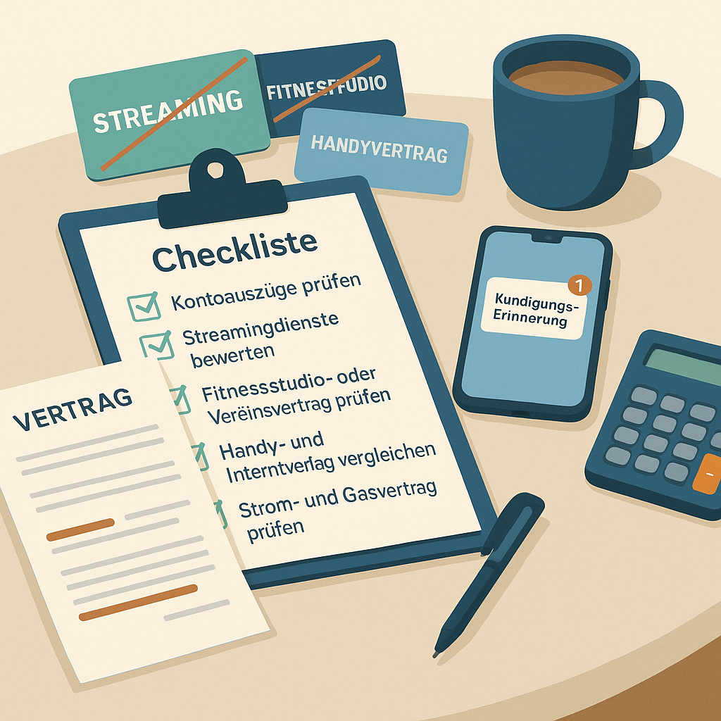 Checkliste Kontoauszüge prüfen Streamingdienste bewerten Fitnessstudio oder Vereinsvertrag prüfen Handy und Internetvertrag vergleichen Strom- und Gasvertrag prüfen