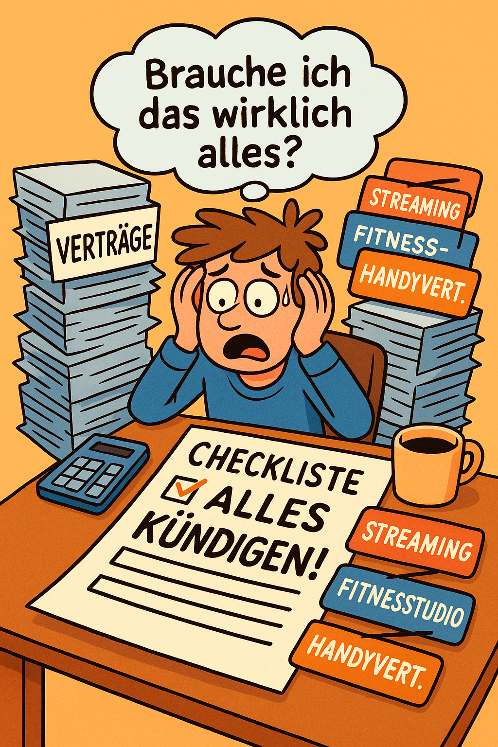 Humorvolle Cartoon-Illustration zum Thema Verträge kündigen Abos optimieren Kosten sparen